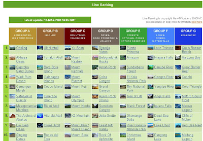 Desde el año pasado(posts 1, 2 y 3) he estado haciendo insistente campaña con el Salto Angel y otros candidatos en la votación para las nuevas siete maravillas naturales del mundo. En un principio, los cybernautas proponían maravillas, de las cuales se eligieron unas 200 para una primera ronda de votaciones. De esta ronda quedaron 77, de las cuales se seguirá depurando la lista para llegar a las siete definitivas y anunciarlas el 7 de julio.